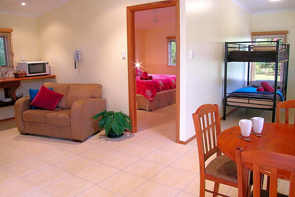 This apartment has a kitchenette, lounge and private bathroom with shower only. Guests have access to properties deck area and shared use of the heated pool and spa, open fireplace and BBQ area. There is a view from the kitchenette into the Rainforest and extinct volcano.